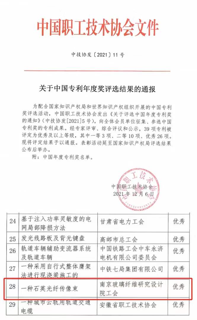 2021年12月6日,中國職工技術(shù)協(xié)會公布首屆中國專利年度獎評選結(jié)果,南京春輝科技實業(yè)有限公司參選的“一種石英光纖傳像束”專利榮獲中國專利年度獎——優(yōu)秀獎。在本次中國專利年度獎評選中,經(jīng)專家評審、綜合評議和公示,共有39項專利被評定為優(yōu)秀及以上等級,其中江蘇省范圍參選專利有9項獲獎。