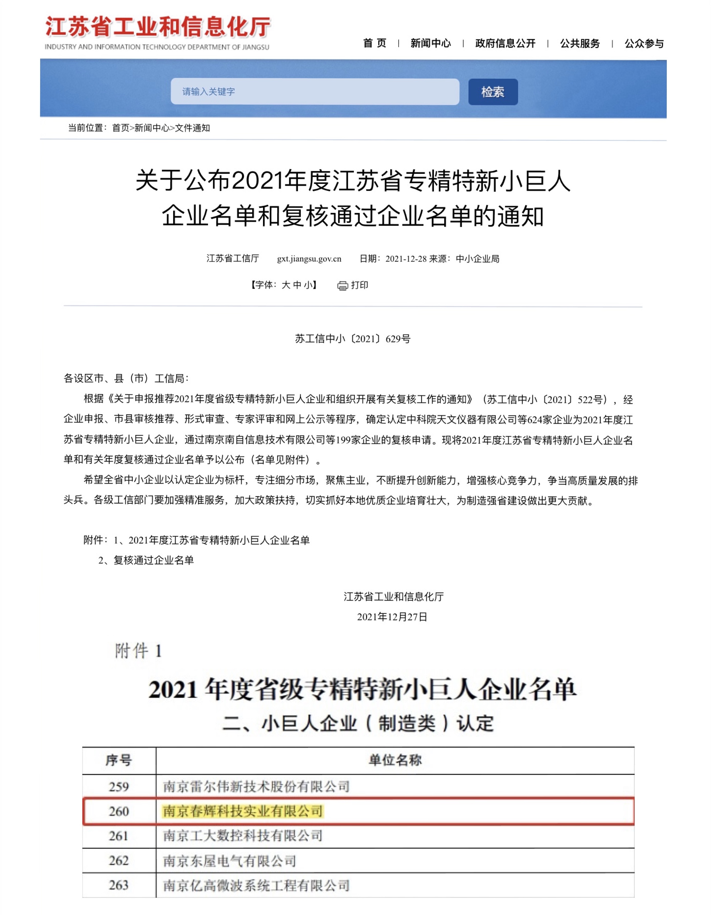 2021年12月27日,江蘇省工業(yè)和信息化廳發(fā)布《關(guān)于公布2021年度省專精特新小巨人企業(yè)名單和復(fù)核通過(guò)企業(yè)名單的通知》,其中南京市僅認(rèn)定了62家,南京春輝科技實(shí)業(yè)有限公司脫穎而出,被認(rèn)定為江蘇省專精特新“小巨人”企業(yè)。