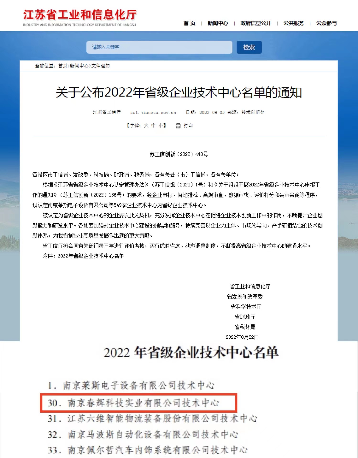 近日,江蘇省工業(yè)和信息化廳公布了2022年江蘇省省級(jí)企業(yè)技術(shù)中心認(rèn)定名單,南京春輝科技實(shí)業(yè)有限公司榜上有名,被認(rèn)定為江蘇省企業(yè)技術(shù)中心。“省級(jí)企業(yè)技術(shù)中心”申請(qǐng)認(rèn)定條件多,審批流程嚴(yán)格,不僅在企業(yè)規(guī)模等經(jīng)濟(jì)指標(biāo)上有較高的要求,而且更注重創(chuàng)新能力,是對(duì)企業(yè)研發(fā)實(shí)力的權(quán)威性認(rèn)可和高度肯定。